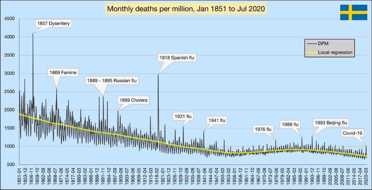 Her ser man dødeligheten i Sverige fra 1851 til 2020. Merk at dødeligheten på slutten av grafen går ned under gjennomsnittet, slik den vanligvis gjør hver sommer. Dette viser at Covid-19 er en sesongbasert infeksjon, som man kan forvente at stiger mer om vinteren.