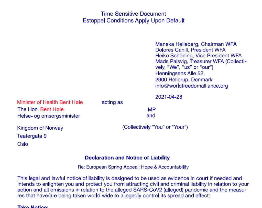 WORLD FREEDOM ALLIANCE Leverer “Letter of Notice” til alle helseministere i Europa.